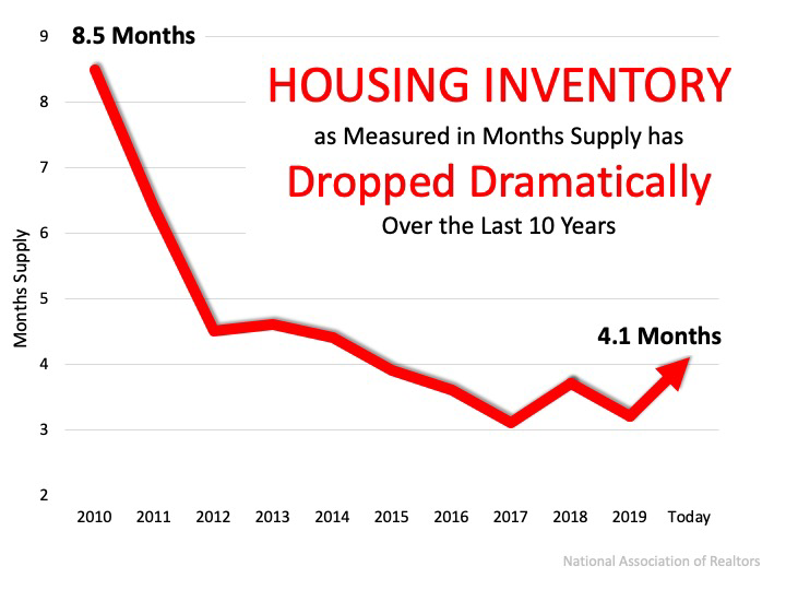 Making our way through the month of June and entering the second half of the year, we face an undersupply of homes on the market. Keep in mind, this undersupply is going to vary by location and by price point. According to the National Association of Realtors (NAR), across the country, we currently have a 4.1 months supply of homes on the market. Historically, 6 months of supply is considered a balanced market. Anything over 6 months is a buyer’s market, meaning prices will depreciate. Anything below 6 months is a seller’s market, where prices appreciate. The graph below shows inventory across the country since 2010 in months supply of homes for sale.